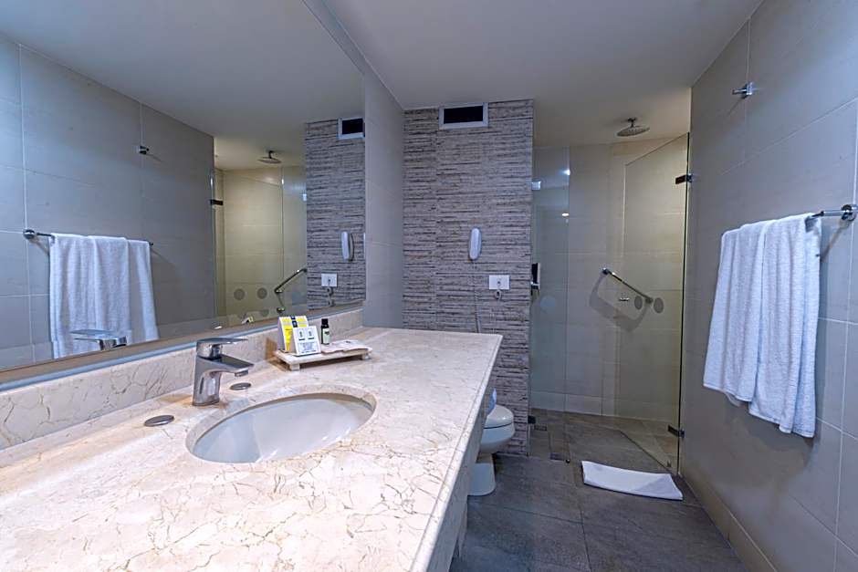 A spacious, air-conditioned room with a separate living room area featuring a sofa and flat-screen cable TV. The room is also equipped with a mini-bar and a private bathroom with a shower.